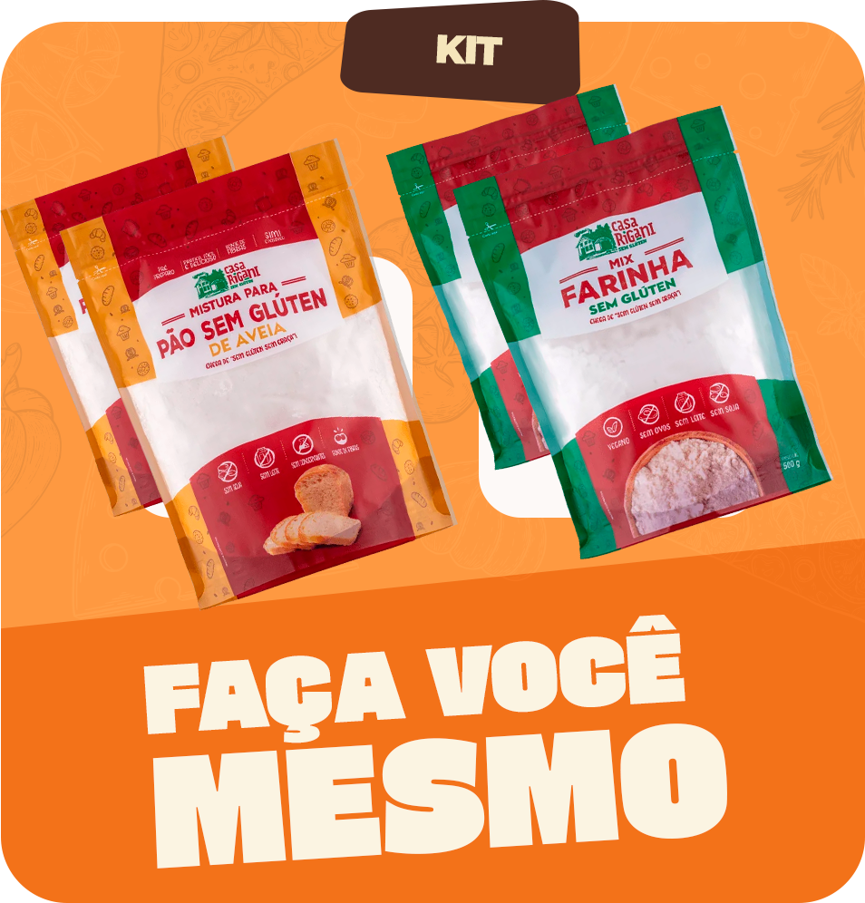 Descubra o novo Kit Faça Você Mesmo da Casa Rigani: são 2 mix de farinha e 2 mistura para pão, todos sem glúten, pensados para quem ama colocar a mão na massa e sentir o cheirinho de pão quentinho saindo do forno. Uma experiência gostosa, leve e criativa — agora em preço promocional!